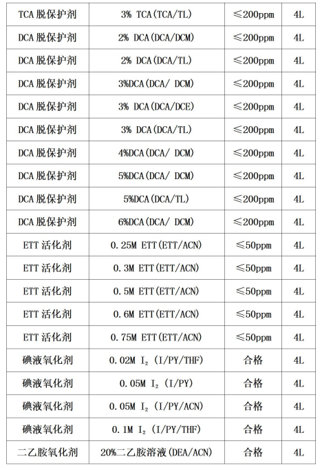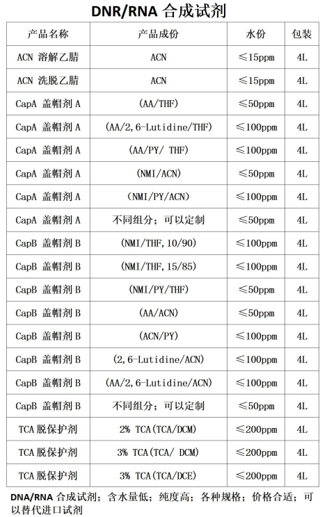 本公司是專業(yè)色譜試劑;環(huán)保試劑;合成試劑;無水試劑等化學(xué)試劑生產(chǎn)廠家,發(fā)揮試劑行業(yè)聯(lián)動優(yōu)勢,憑借專業(yè)的試劑研發(fā)能力,最新開發(fā)了寡核苷酸DNA/RNA合成試劑系列。包括極低含水量的超干乙腈,各種成份的脫保護(hù)劑、活化劑、蓋帽劑A;蓋帽劑B、碘液氧化劑、二乙胺氧化劑。該類型的合成試劑經(jīng)過特殊的純化工藝,滿足嚴(yán)格的技術(shù)指標(biāo),可確保優(yōu)異的合成效率,是寡核苷酸合成的首選。所有的溶劑和試劑都經(jīng)過嚴(yán)格的蒸餾,濾膜過濾,減少了固體微粒污染,提高了產(chǎn)品純度,增加了試劑反應(yīng)靈敏度。